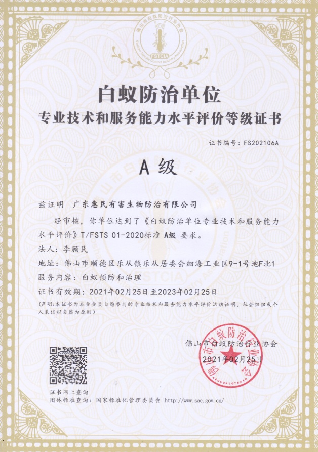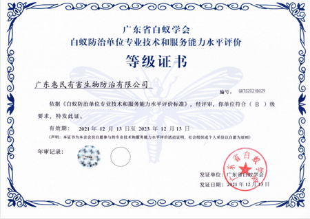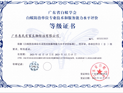 廣東省白蟻學(xué)會(huì)白蟻防治單位專業(yè)技術(shù)和服務(wù)能力水平B級(jí)證書